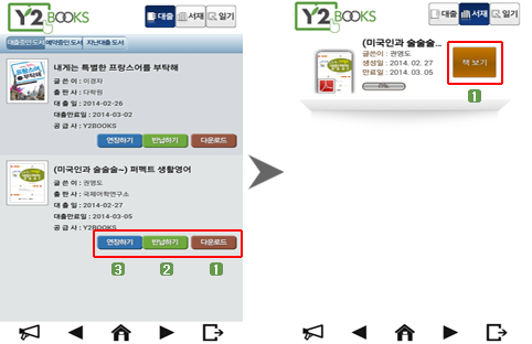 - 3. 다운로드한 전자책이 표시됩니다. 책읽기를 터치하여 책읽기를 진행합니다.
